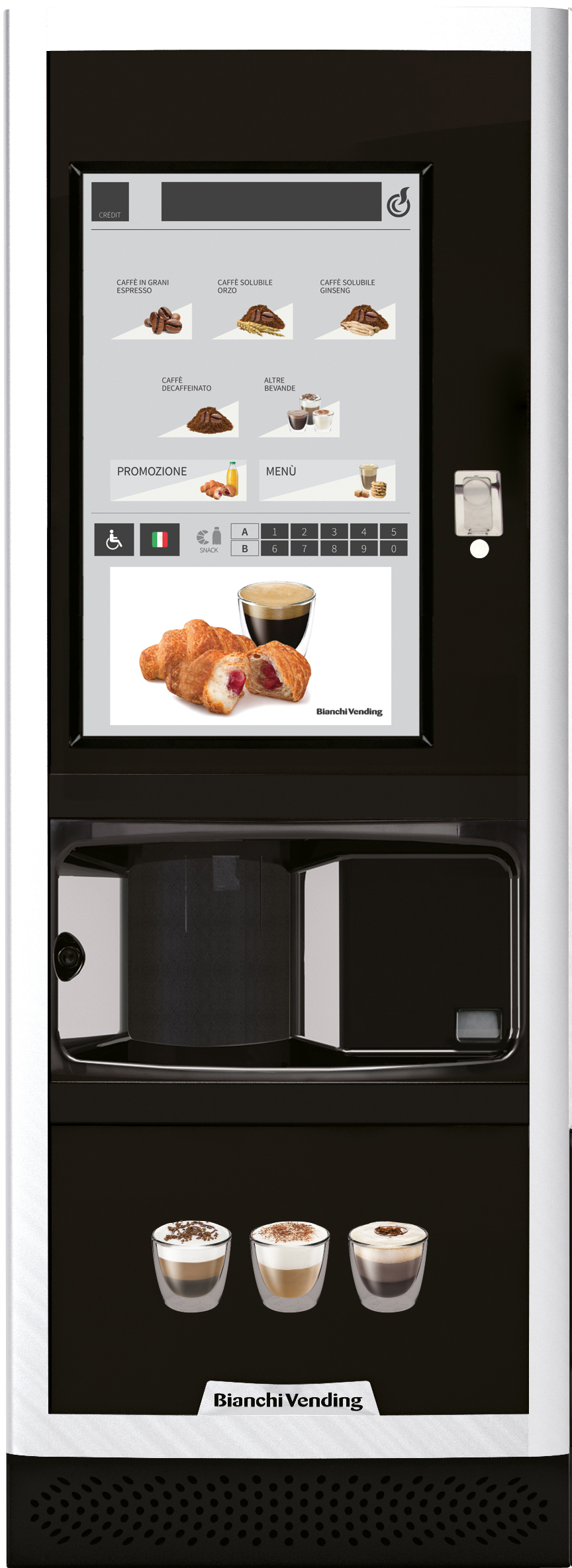 INTELIGENCE ZALOŽENA NA DOTEKU Nejmodernější technologie, dotykový displej, vysoká funkčnost s nejlepší komunikací. Automatický stroj na studené i teplé nápoje, dvojitý dávkovač. Kapacita 900 až 1200 kelímků. Až 30 možností výběru nápojů. Velká, přehledná nabídka nápojů. Nastavitelné dávkování cukru. Akustický signál po dokončení extrakce. Zamykatelná odběrová dvířka při extrakci. Podsvícení prostoru extrakce. Velký LCD displej zvyšuje komunikační možnosti mezi strojem a zákazníkem. Nutriční info o nápojích a přítomnosti alergenů. Možnost výběru až 6 jazyků, velmi užitečné na veřejných místech, frekventovaných místech – např. letiště Zesílené dveře a panty proti vandalství. Snadno dostupné a vyjímatelné součásti stroje. Dvojitý, nastavitelný dávkovač kelímků 70 - 73 mm Automatická regulace mletí a teploty každého nápoje.