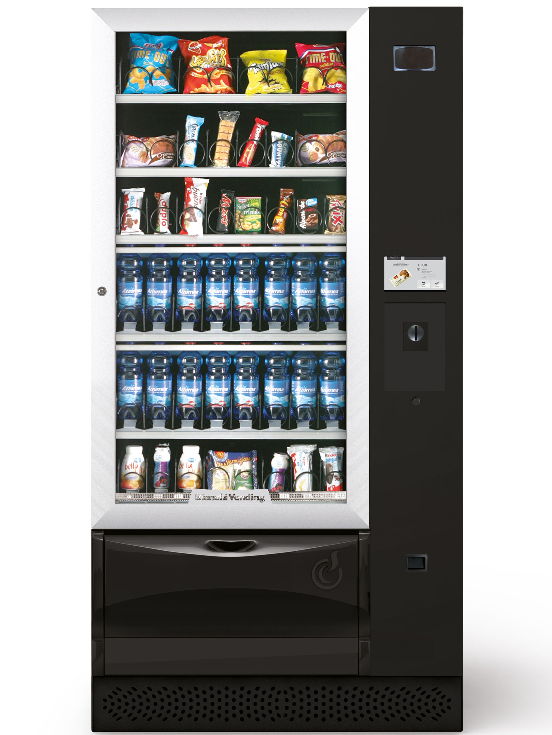 TECHNOLOGIE A SERVIS NA VYSOKÉ ÚROVNI Velký prodejní automat se spirálami, chlazený na 3°C, vhodný pro prodej občerstvení, cukrovinek, sendvičů, jogurtů či chlazených nápojů v plechovkách nebo láhvích Atraktivní design s hliníkovým rámem dveří. Alfanumerická klávesnice z nerezové oceli a 12 tlačítky. 32místný grafický LCD displej. Kompatibilní s telemetrií. Automatický diagnostický systém. Velké skleněné okno osvětlené LED diodami. Dostupný ve více variantách: